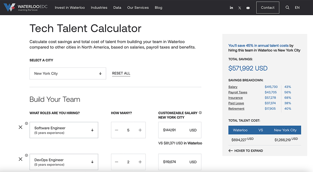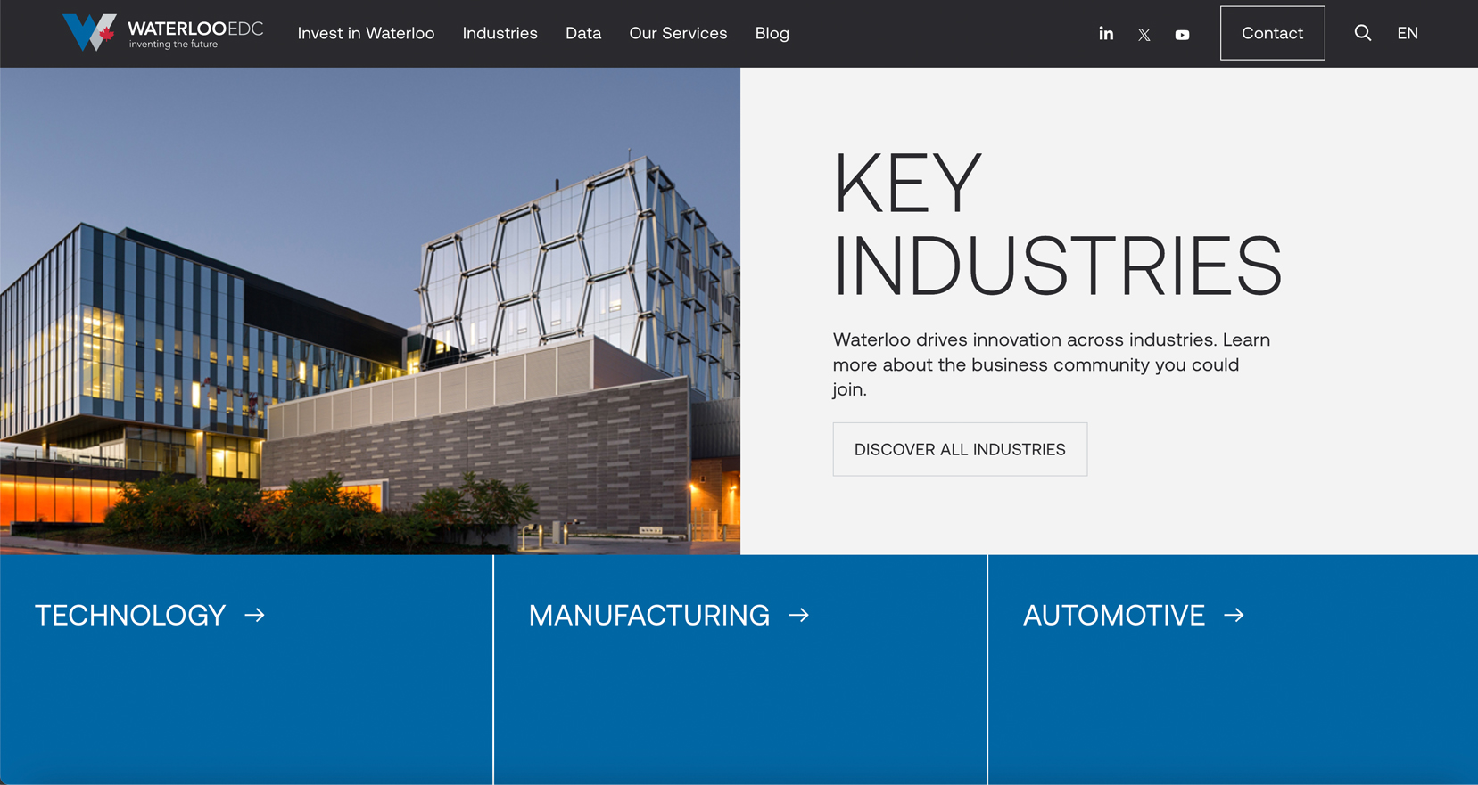 I lead the website development (waterlooedc.ca), design, video, digital brand advertising, and analytics for Waterloo EDC, the economic development agency for one of Canada's largest municipalities.