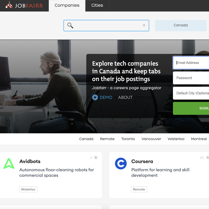 Jobfairr.com is a careers page aggregator that I designed and coded to make it easy to discover tech companies in Canada and keep tabs on their job openings. More than 25,000 Canadians have used this job search tool to check tech company career pages. I dedicated 1,000+ hours to designing, coding, populating, and marketing this user-friendly and fully responsive Ruby on Rails app while working full-time. This is a personal project I worked on between 2015 - 2018, and began revamping throughout 2025.